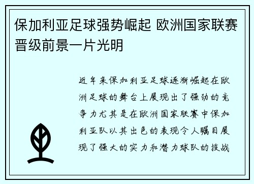 近年来,保加利亚足球逐渐崛起,在欧洲足球的舞台上展现出了强劲的竞争力。尤其是在欧洲国家联赛中,保加利亚队以其出色的表现令人瞩目,展现了强大的实力和潜力。球队的技战术水平不断提高,年轻球员的涌现更是让人对其未来充满期待。保加利亚足球的崛起,离不开其足球体系的改革、青训的发展以及球员个人素质的提升。本文将从四个方面详细阐述保加利亚足球强势崛起的原因,并展望其在欧洲国家联赛中的晋级前景。通过这些分析,我们可以看到,保加利亚足球的未来一片光明,值得期待。